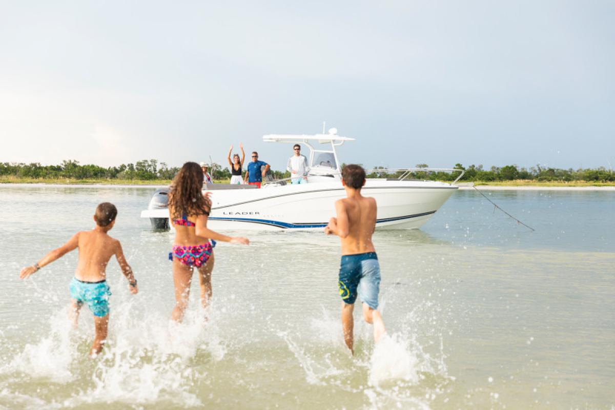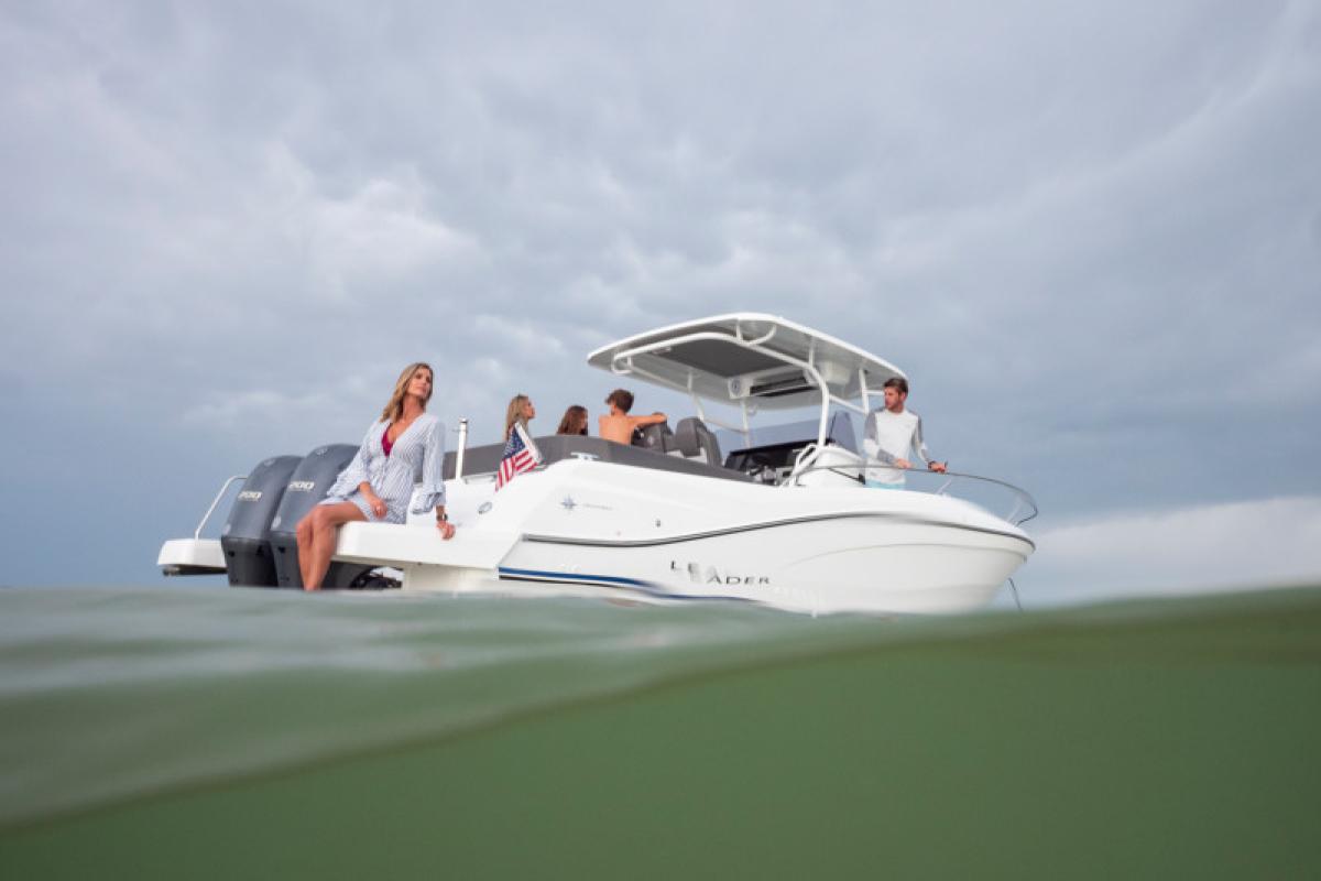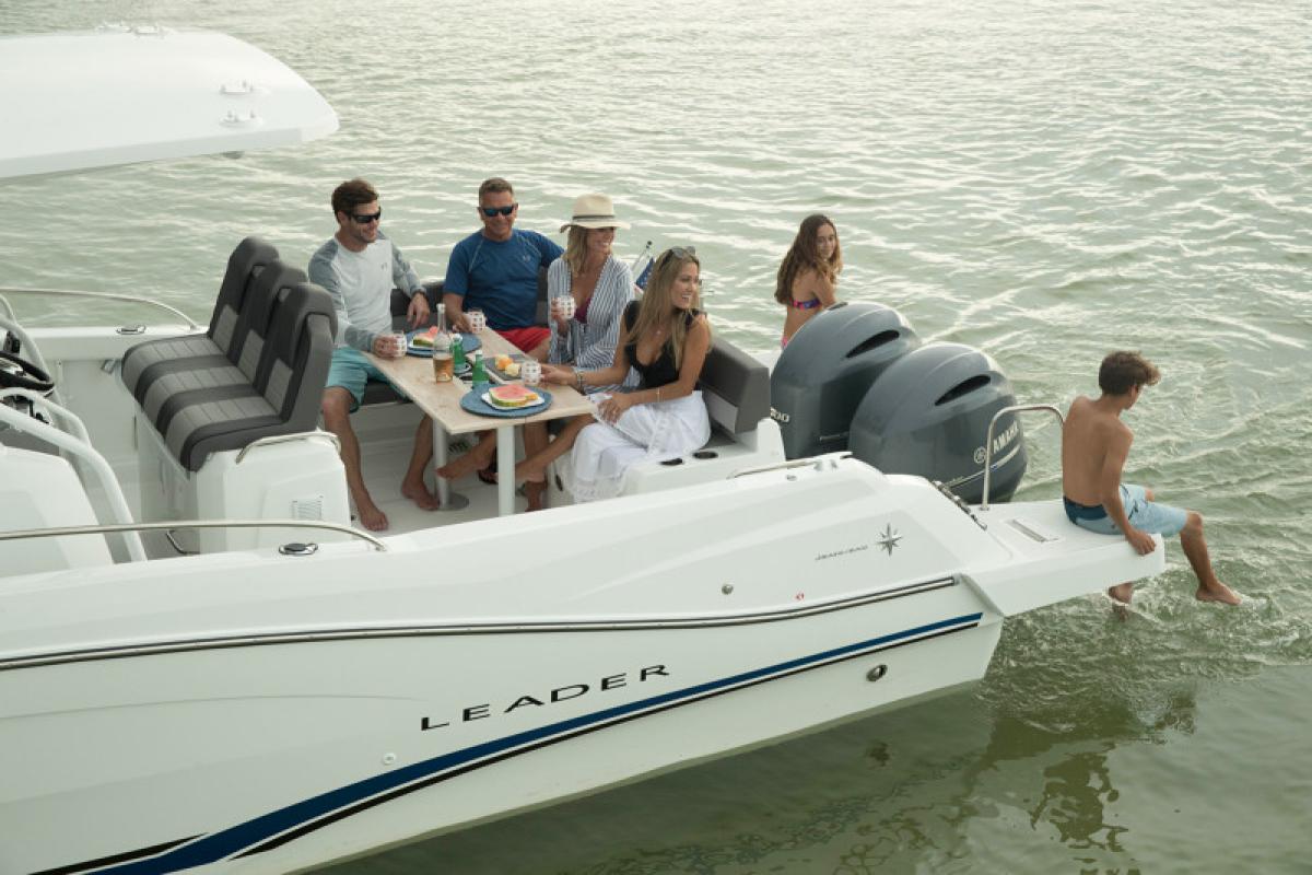 The Jeanneau Leader 9.0 CC is a spacious 29-footer capable of carrying 11 guests in comfort as there is a place for everyone throughout the boat. The helm features three seats perfectly situated so the full array of electronics is always withing view. The cockpit features two side bench seats and an aft bench seat with storage underneath. The Leader 90.0 cc is perfectly adapted for fishing equipped with leaning post, live well, rod holders and cooler/fishbox. However, the boat is also adaptable for family outings as it can be equipped with a cockpit grill or stove, sink and refrigerator. Of course, there is lots of storage.