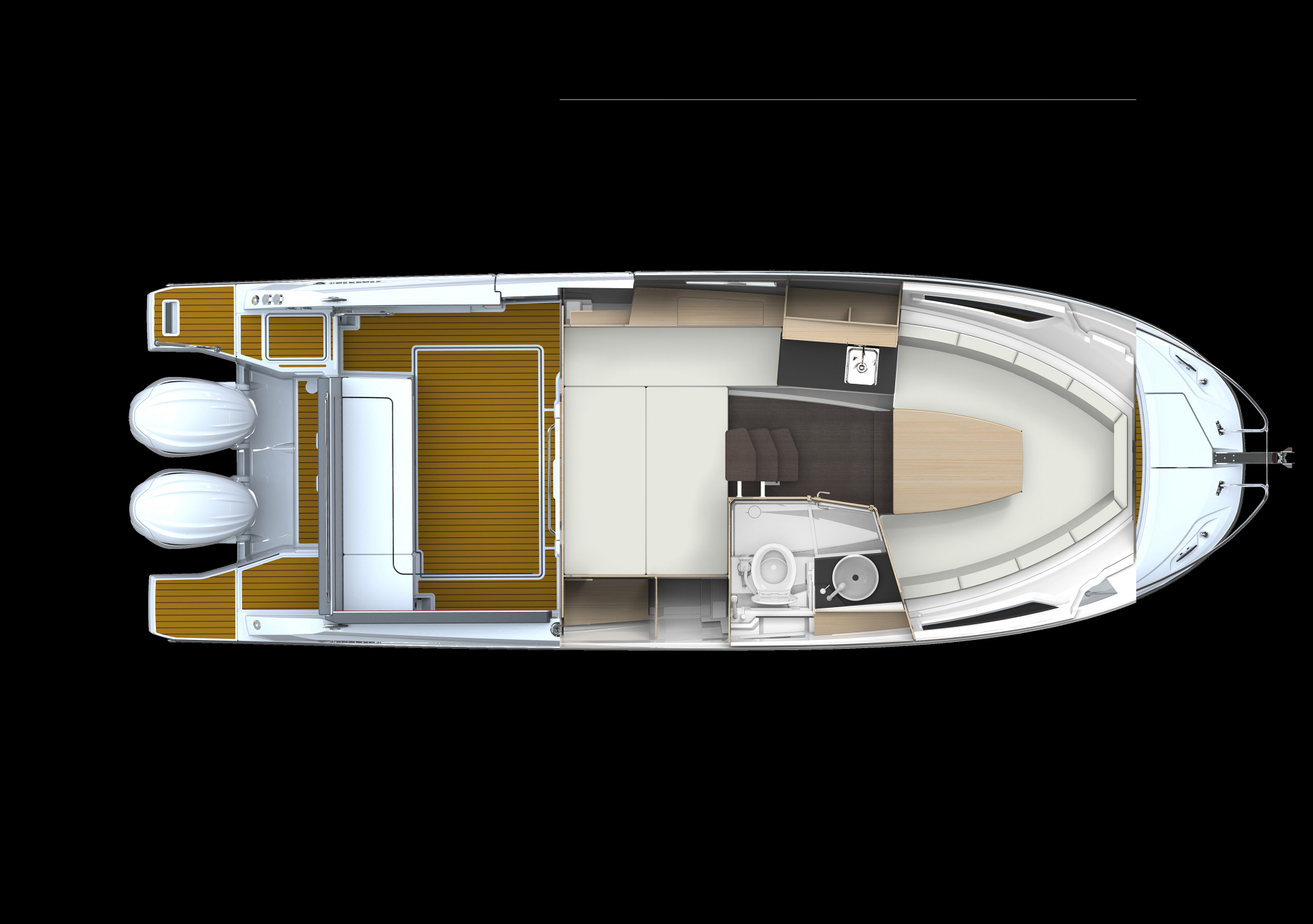 Spirited while cruising, the Leader 10.5 WA is dedicated to relaxation and a laid-back lifestyle when at anchor. The foldaway backrest of the aft bench seat transforms the aft cockpit into a vast sundeck in just seconds. The side terrace extends the cockpit and provides secure, easy access to the sea, for swimming in complete safety.